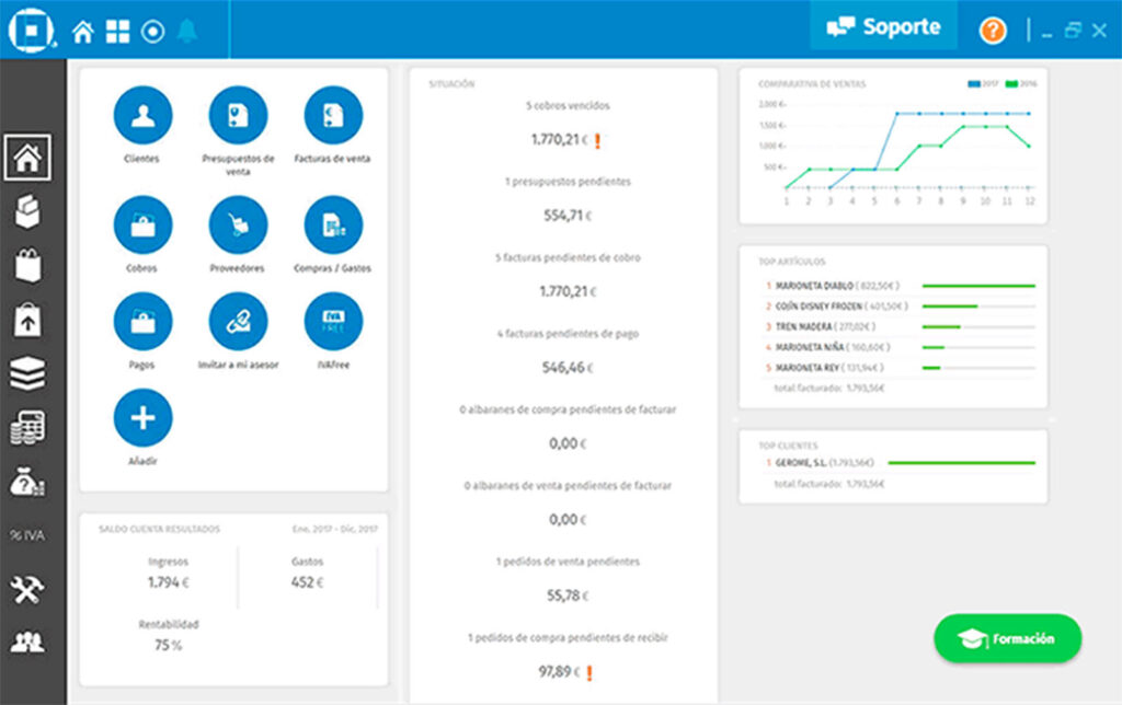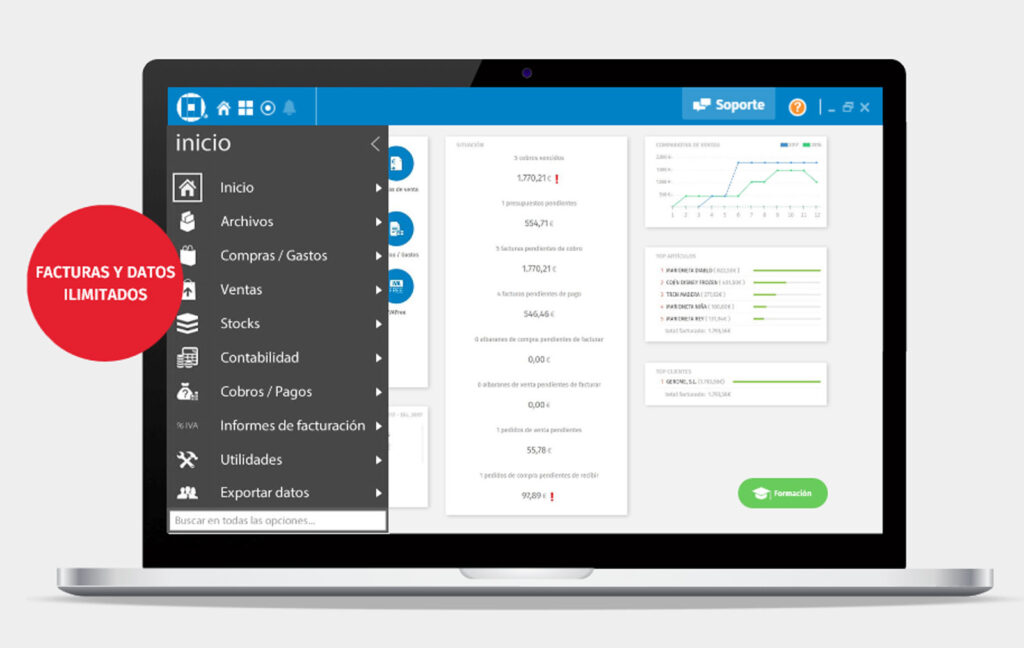 Por último, se debe destacar que desde la pantalla inicial del a3factura, podréis ver con un solo vistazo la información más importante que necesitéis en ese momento, de esta forma siempre podréis tener runa visión global del estado actual de vuestra empresa como los niveles de facturación o la evolución del negocio.