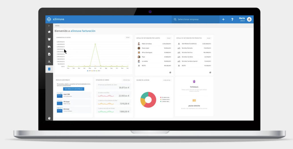 Además, a3innuva ERP se adapta al crecimiento de tu empresa. Es un sistema escalable y modular que ofrece funciones avanzadas como control de stock, gestión de comisiones y representantes, política de precios, cuotas y más.