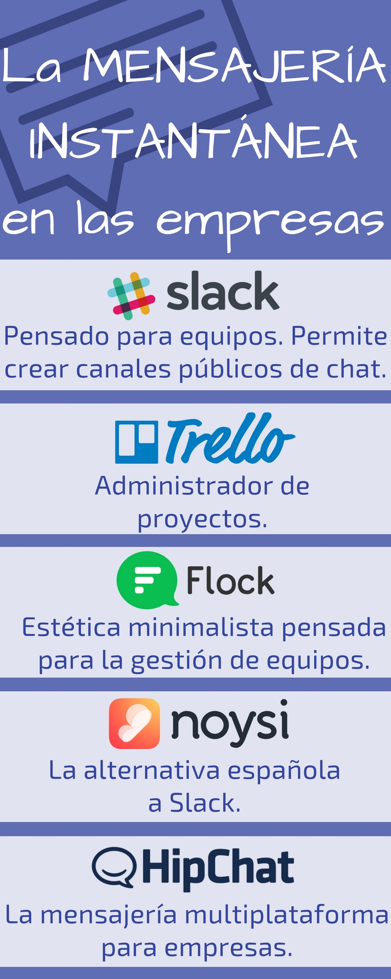 Pero Slack no es la única herramienta que promueve el chat como canal de comunicación empresarial, también lo son Flock, Trello, Hipchat o Noysi.