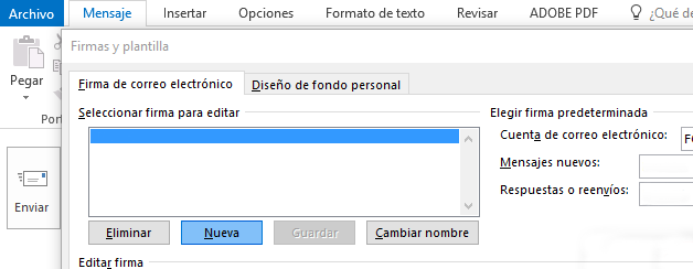 Seleccionamos nueva en el cuadro de diálogo y escribimos un nombre para nuestra firma