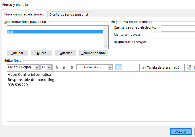 En el cuadro editar firma, escribimos el contenido de nuestra firma y aceptamos